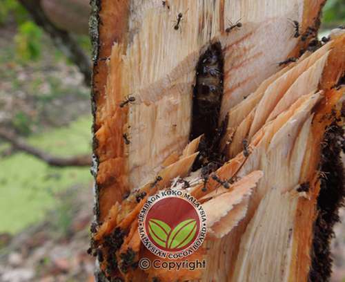 - Larva mengorek bermula dari ranting menuju ke dahan dan akhirnya ke batang utama dan seterusnya hingga ke pangkal batang utama