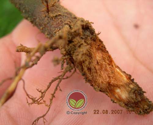 - Anak pokok koko terutama yang baru dipindahkan ke ladang akan kelihatan layu sekiranya telah diserang