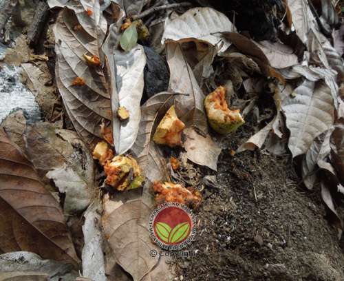 - Ketulan kulit buah koko berselerak di bahagian lantai tanah pada buah yang diserang.