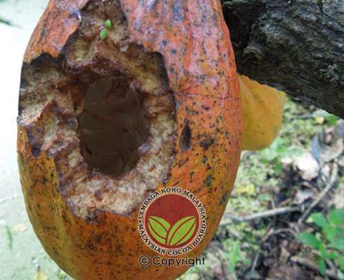 - Lubang tebukan pada buah koko lebih besar berbanding tikus dan membujur serta luka kecerunan kulit yang lebih condong